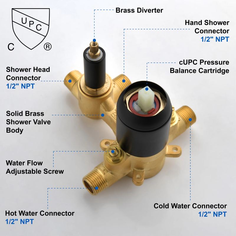 - Advanced monitor pressure balance ceramic disc cartridge with CUPC certification can effectively protect you or your family from scalding injury caused by sudden changes in hot or cold water pressure: such as your child rush the toilet meanwhile you are showering; Built-in check valve can effectively prevent banging noise(water hammer phenomenon).