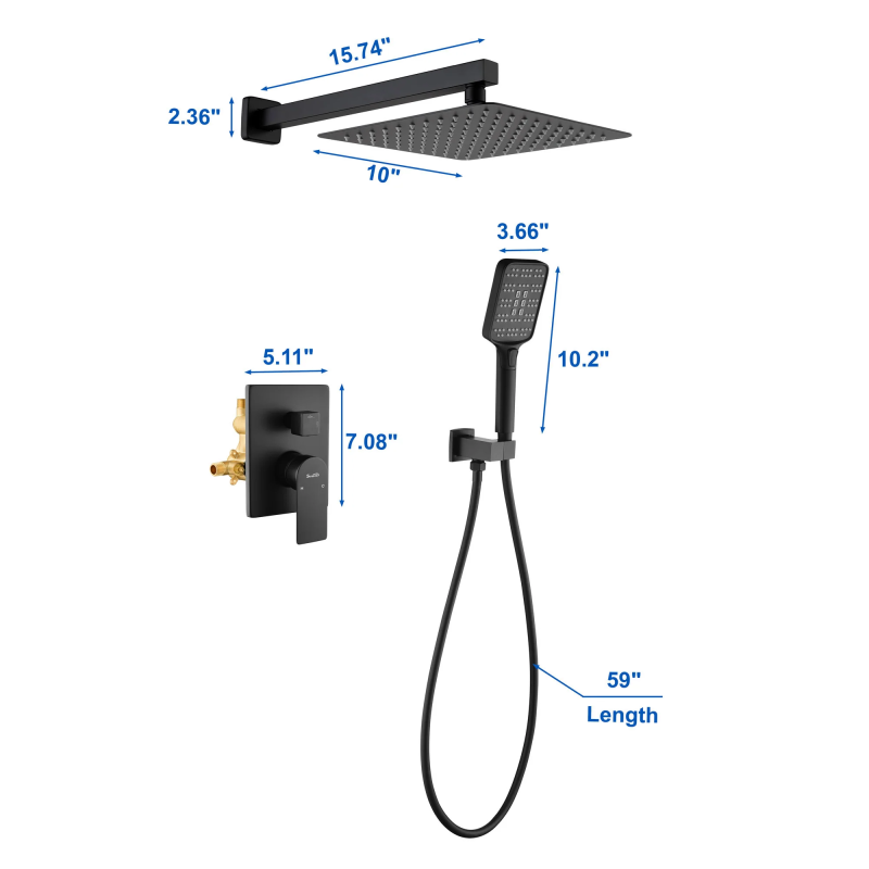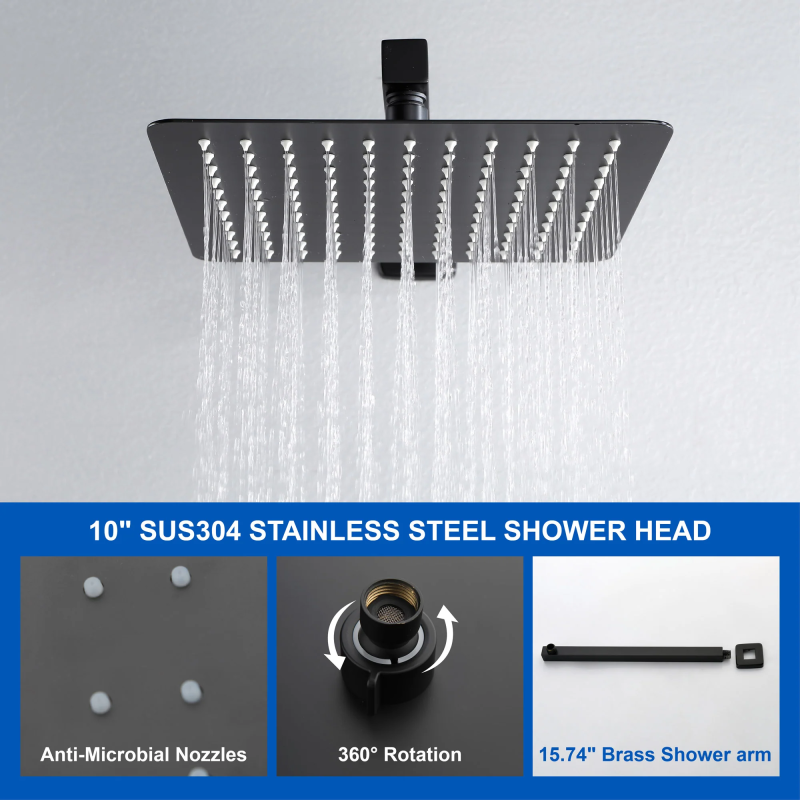 - A premium 10-inch overhead shower head, crafted from durable SUS304 stainless steel for a sleek look and long-lasting performance. Freely adjust the shower angle to suit your needs to improve the shower experience.