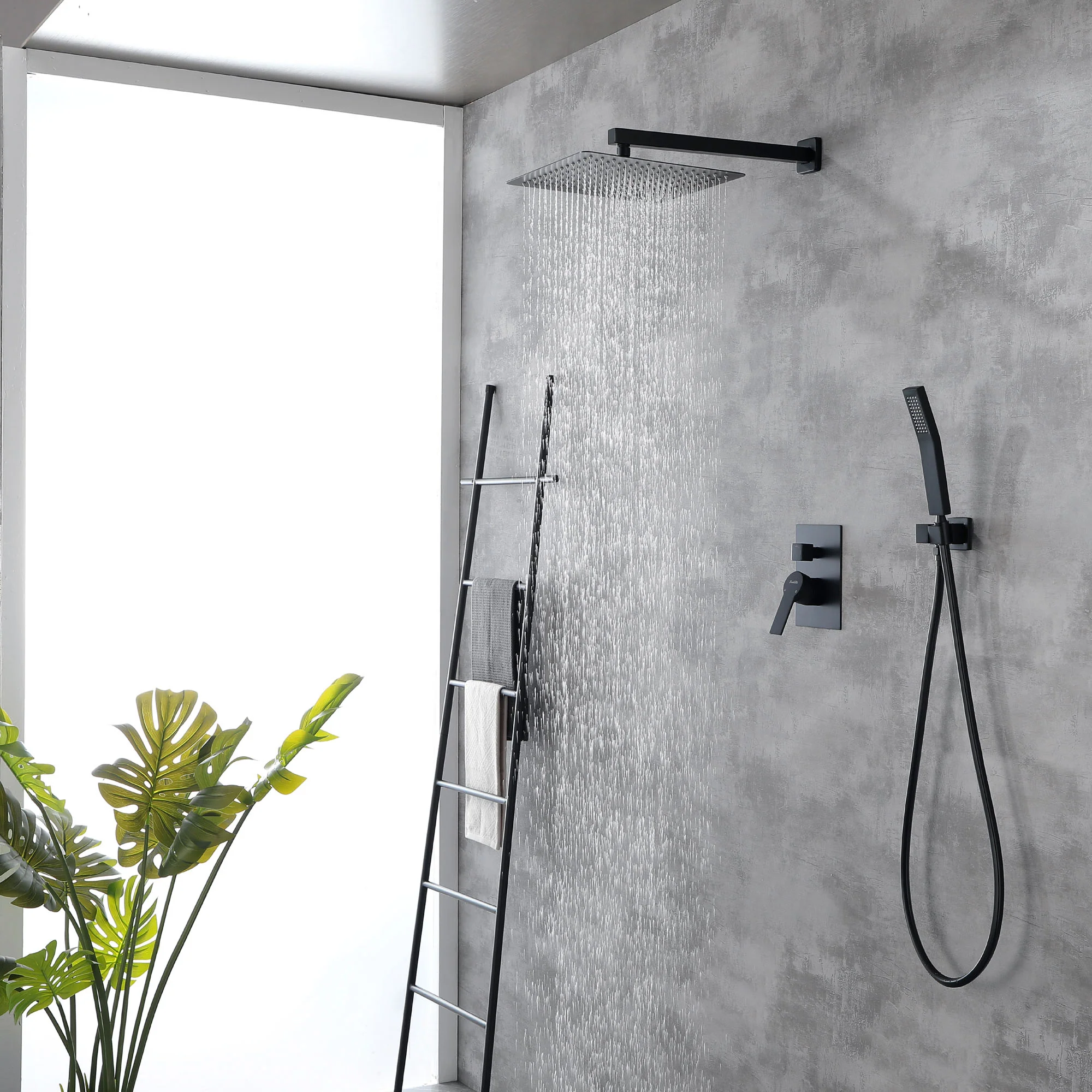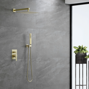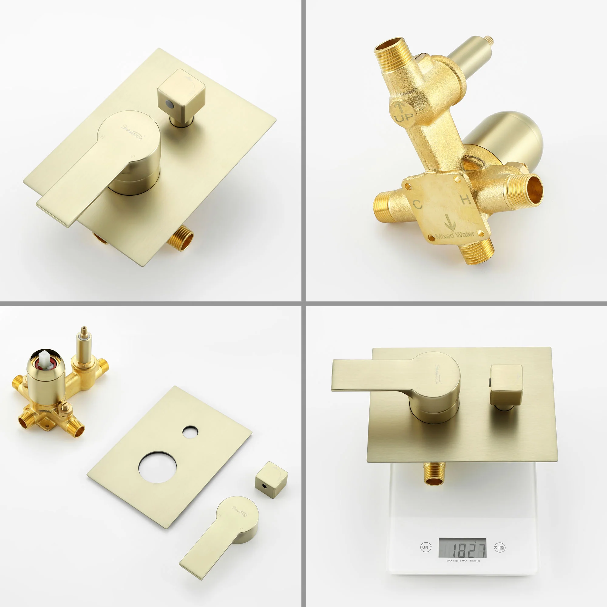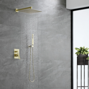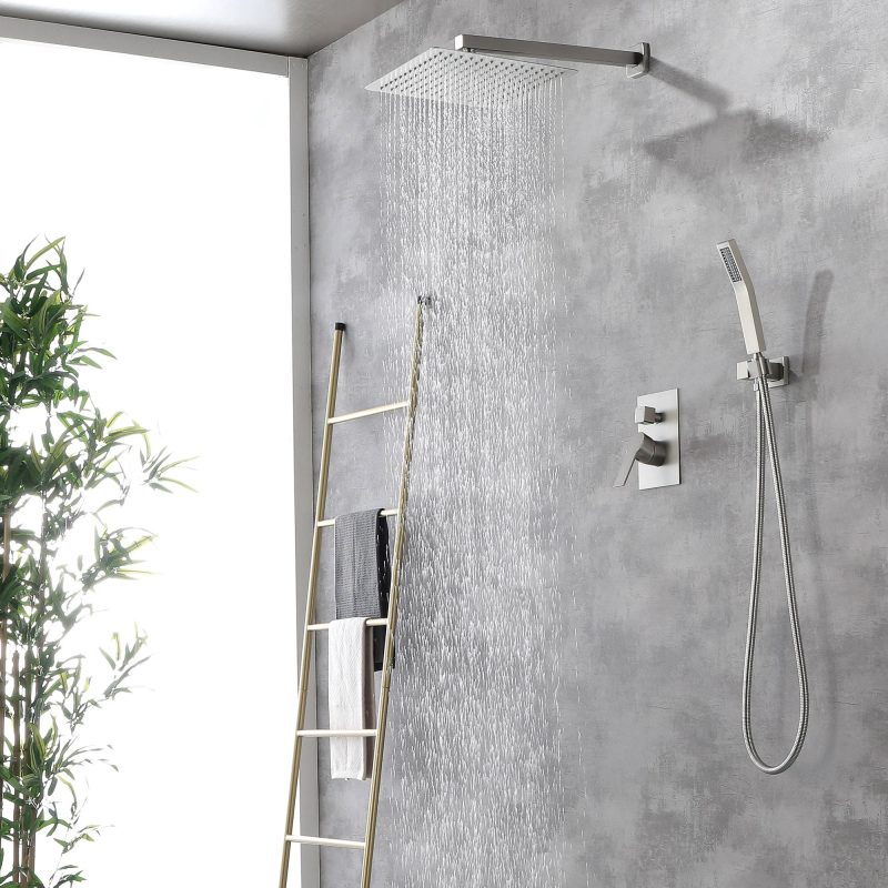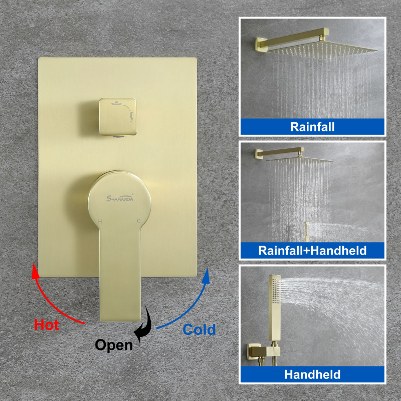 - 12 inches square rain shower head(SUS304 Stainless steel), handheld shower head(Brass), 15.7 inches shower arm(Brass), 59-Inch shower hose(High quality PVC ), shower holder(Brass), shower mixer valve body(Brass) and other necessary installation parts.