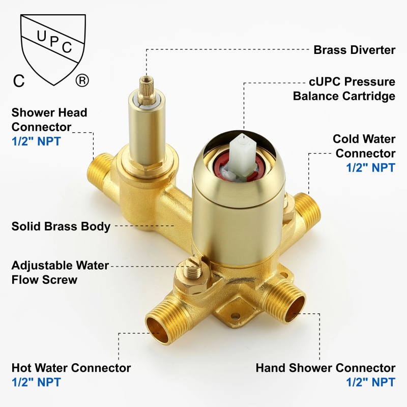 - Advanced pressure balance ceramic disc cartridge with cUPC certification can effectively protect you and your family from scalding injury caused by sudden changes in hot or cold water pressure.